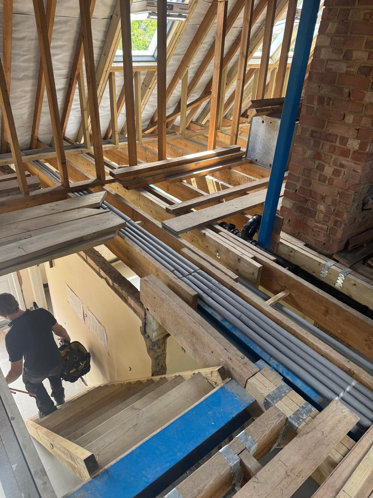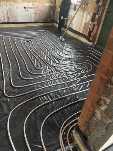 The walls were insulated prior to pipework installation. The underfloor heating and screeding downstairs was complemented by a radiator system upstairs. New bathrooms were installed.