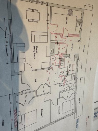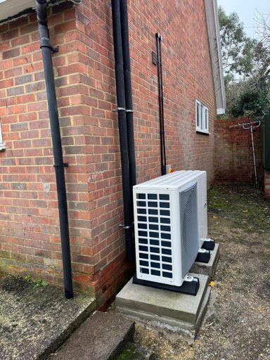 This was a bungalow of not very efficient design and build with an EPC rating of an E. Post completion the new installation improved it to a C rating. This required uplifting the existing floors and replacing with underfloor heating powered by an air source heat pump sited externally at the rear of the building.